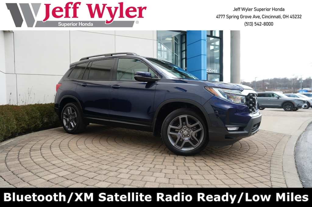 Jeff Wyler Superior Honda is pleased to offer this great-looking 2023 Honda Passport EX-L in Obsidian Blue Pearl. BLUETOOTH, LEATHER, MOONROOF SUNROOF, CLEAN CARFAX...NO ACCIDENTS, and ONE OWNER Passport EX-L, HondaTrue Certified Certified, 4D Sport Utility, 3.5L V6 24V SOHC i-VTEC, 9-Speed Automatic, AWD, Obsidian Blue Pearl, Gray Leather, 4-Wheel Disc Brakes, 4.334 Axle Ratio, 7 Speakers, A/V remote: CabinControl, ABS brakes, Air Conditioning, Alloy wheels, AM/FM radio: SiriusXM, Apple CarPlay/Android Auto, Auto High-beam Headlights, Auto-dimming Rear-View mirror, Automatic temperature control, Blind Spot Information (BSI) System warning, Brake assist, Bumpers: body-color, Delay-off headlights, Driver door bin, Driver vanity mirror, Driver's Seat Mounted Armrest, Dual front impact airbags, Dual front side impact airbags, Electronic Stability Control, Emergency communication system: HondaLink Assist, Exterior Parking Cameras, Four wheel independent suspension, Front anti-roll bar, Front Bucket Seats, Front Center Armrest, Front dual zone A/C, Front reading lights, Fully automatic headlights, Garage door transmitter: HomeLink, Heated door mirrors, Heated Front Bucket Seats, Heated front seats, Illuminated entry, Lane departure: Lane Keeping Assist System (LKAS) active, Leather-Trimmed Seats, Low tire pressure warning, Occupant sensing airbag, Outside temperature display, Overhead airbag, Overhead console, Panic alarm, Passenger door bin, Passenger seat mounted armrest, Passenger vanity mirror, Power door mirrors, Power driver seat, Power Liftgate, Power moonroof, Power passenger seat, Power steering, Power windows, Radio data system, Radio: 215-Watt Audio System w/7 Speakers, Rear air conditioning, Rear anti-roll bar, Rear reading lights, Rear seat center armrest, Rear window defroster, Rear window wiper, Remote keyless entry, Security system, Speed control, Speed-sensing steering, Split folding rear seat, Spoiler, Steering wheel mounted audio controls, Tachometer, Telescoping steering wheel, Tilt steering wheel, Traction control, Trip computer, Turn signal indicator mirrors, Variably intermittent wipers, and Wheels: 20" Pewter Gray Alloy Our PRE-OWNED vehicles are put through a rigorous 167- POINT QUALITY ASSURANCE INSPECTION along with an average amount of over $1,400.00 SPENT to recondition each vehicle so we can be sure to deliver you the highest quality vehicle like you deserve! ***ONLINE PRICE DOES NOT INCLUDE WYLER FAMILY FIRST PACKAGE*** Stop by 4777 Spring Grove Ave. Road to see for yourself, or give us a call @ 283-209-1858 to schedule your test drive!