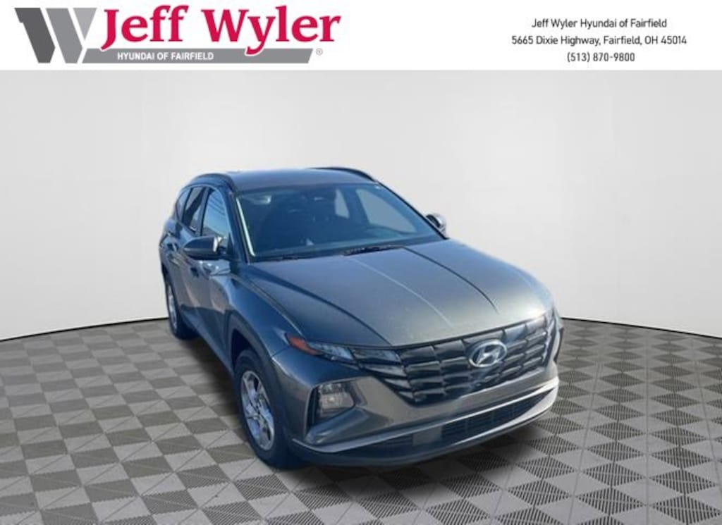 CARFAX One-Owner. Clean CARFAX. Jeff Wyler Hyundai of Fairfield is delighted to offer this good-looking 2022 Hyundai Tucson SEL in Amazon Gray. Well equipped with: Cargo Package (Cargo Net, Cargo Tray, and First Aid Kit), Option Group 01, Hyundai Certified Used Vehicles Certified, AWD, Android Auto, Apple CarPlay, CALL NOW FOR YOUR VIP APPOINTMENT 513-870-9800, FULLY SERVICED w/RECORDS, GUARANTEED FINANCING!! NO MATTER YOUR SITUATION WE CAN GET AN APPROVAL!!, THE #1 Volume dealer in the region! Come see why for yourself Today!!, WE PAY MORE FOR YOUR TRADE!!, 3.648 Axle Ratio, 4-Wheel Disc Brakes, 6 Speakers, ABS brakes, Air Conditioning, Alloy wheels, AM/FM radio: SiriusXM, Apple CarPlay & Android Auto, Auto High-beam Headlights, Brake assist, Bumpers: body-color, Carpeted Floor Mats, Delay-off headlights, Driver door bin, Driver vanity mirror, Dual front impact airbags, Dual front side impact airbags, Electronic Stability Control, Emergency communication system: Blue Link Connected Car Service (3-year complimentary subscription), Four wheel independent suspension, Front and Rear Mudguards, Front anti-roll bar, Front Bucket Seats, Front Center Armrest, Front reading lights, Fully automatic headlights, Heated door mirrors, Heated Front Bucket Seats, Heated front seats, Illuminated entry, Low tire pressure warning, Occupant sensing airbag, Outside temperature display, Overhead airbag, Overhead console, Panic alarm, Passenger door bin, Passenger vanity mirror, Power door mirrors, Power driver seat, Power steering, Power windows, Radio data system, Radio: AM/FM/HD/SiriusXM Audio System, Rear anti-roll bar, Rear Bumper Applique, Rear seat center armrest, Rear window defroster, Rear window wiper, Remote keyless entry, Roof rack: rails only, Security system, Speed control, Split folding rear seat, Spoiler, Stain & Odor Resistant Cloth Seat Trim, Steering wheel mounted audio controls, Tachometer, Telescoping steering wheel, Tilt steering wheel, Traction control, Trip computer, Turn signal indicator mirrors, Variably intermittent wipers, Wheel Locks, and Wheels: 17" x 7.0J" Alloy. Certified. TO CHECK ON THE AVAILABILITY OF THIS VEHICLE REACH OUT TO ONE OF OUR TEAM MEMBERS!! ALSO SHOP ONLINE AT https://www.jeffwylerhyundaioffairfield.com/ Proudly Serving: Cincinnati, Dayton, Columbus, Louisville, Lexington, Indianapolis, Hamilton, Florence, Alexandria, Beavercreek, Springdale, West Chester, Monroe, Fairfield, Kenwood, Newport and all of greater Cincinnati Ohio, Indiana, and Northern Kentucky.