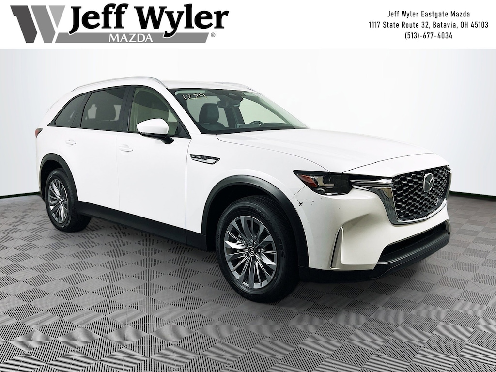 Jeff Wyler Eastgate Auto Mall is pumped up to offer this good-looking 2025 Mazda CX-90 3.3 Turbo Select in Rhodium White Premium. Well equipped with: 3rd row seats: bench, 4-Wheel Disc Brakes, 8 Speakers, ABS brakes, Air Conditioning, Alloy wheels, AM/FM radio, AppLink/Apple CarPlay and Android Auto, Auto High-beam Headlights, Automatic temperature control, Brake assist, Bumpers: body-color, Cargo Net, Compass, Crossbars in Silver, Delay-off headlights, Digital Rearview Mirror w/HomeLink, Driver door bin, Driver vanity mirror, Dual front impact airbags, Dual front side impact airbags, E911 Automatic Emergency Notification, Electronic Stability Control, Emergency communication system: MAZDA CONNECT, Exterior Parking Camera Rear, Four wheel independent suspension, Front anti-roll bar, Front Bucket Seats, Front Center Armrest w/Storage, Front dual zone A/C, Front reading lights, Fully automatic headlights, Heated door mirrors, Illuminated entry, Infotainment System Voice Command, Knee airbag, Leather Shift Knob, Leather steering wheel, Leatherette Seat Trim, Low tire pressure warning, Mazda Connected Services, Occupant sensing airbag, Outside temperature display, Overhead airbag, Overhead console, Pandora Internet Radio Integration, Panic alarm, Passenger door bin, Passenger vanity mirror, Power door mirrors, Power driver seat, Power Liftgate, Power steering, Power windows, Radio Broadcast Data System Program Information, Radio data system, Radio: AM/FM w/HD/8-Speaker Sound System, Rain sensing wipers, Rear air conditioning, Rear anti-roll bar, Rear reading lights, Rear seat center armrest, Rear window defroster, Rear window wiper, Remote keyless entry, Rhodium White Premium Paint Charge, SMS Text Msg Audio Delivery & Reply, Speed control, Speed-sensing steering, Split folding rear seat, Spoiler, Steering wheel mounted audio controls, Tachometer, Telescoping steering wheel, Tilt steering wheel, Traction control, Trip computer, Turn signal indicator mirrors, Variably intermittent wipers, Wheels: 19" x 8.5J Aluminum Alloy, and Wireless Charging Pad. Clean CARFAX. Certified. Mazda Certified Pre-Owned Details: * Transferable Warranty * Powertrain Limited Warranty: 84 Month/100,000 Mile (whichever comes first) from original in-service date * Warranty Deductible: $0 * Limited Warranty: 12 Month/12,000 Mile (whichever comes first) after new car warranty expires or from certified purchase date * Roadside Assistance * Vehicle History * Includes Autocheck Vehicle History Report with 3 Year Buyback Protection. 3 month SiriusXM trial subscription. * 160 Point InspectionAsk about available certifications. Used vehicles 10 years of age or newer with less than 100,000 miles are eligible for the Wyler Assurance Program, but eligible vehicles must pass our reconditioning process and multi-point inspection. Provided the vehicle passes inspection, vehicles will be eligible for the 6 month/6,000 mile limited warranty. The 6 month/6,000 mile limited warranty is NOT available on AS-IS vehicles, wholesale vehicles, lease buyback/pass-thru vehicles or un-inspected vehicles. Note that this program can also apply to vehicles where the remaining factory coverage is less than 6 months or 6,000 miles. Please check the Federal Trade Commission (FTC) Buyers guide on the vehicle for full details as to whether or not warranty coverage may apply. Contact Dealer for additional details. The Wyler Assurance 6 month/6,000 Mile limited warranty ends 6 months from the date of the Retail Purchase Agreement (BUYERS ORDER) or when the vehicle's odometer registers 6,000 additional miles to the mileage listed on the BUYERS ORDER, whichever comes first. Your Deductible - The warranty holder on your contract pays the first $100 of each covered repair.