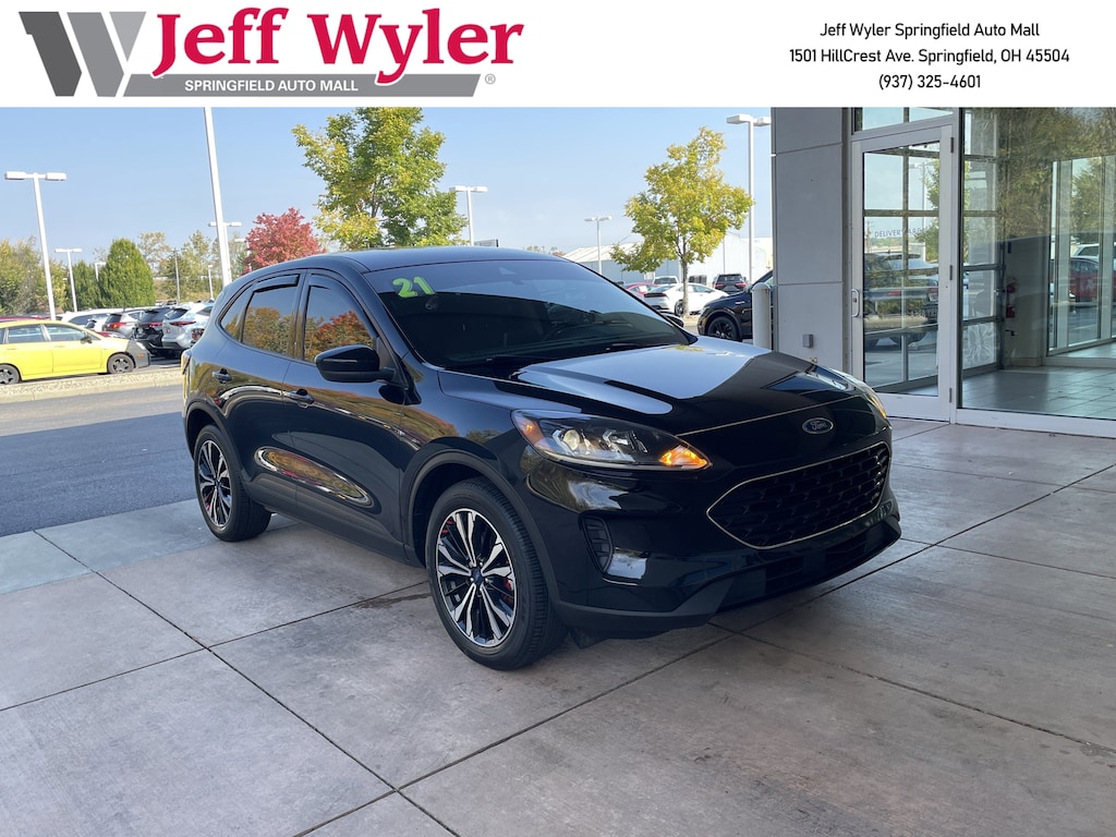 Jeff Wyler Springfield Auto Mall is excited to offer this great-looking 2021 Ford Escape SE in Black. Well equipped with: Cold Weather Package (Electronic Automatic Temperature Control (EATC), Heated & Premium Wrapped Steering Wheel, Heated Front Row Seats, Heated Sideview Mirrors, and Remote Start System w/86C), Equipment Group 200A, SE Sport Appearance Package (Black Front & Rear Bumpers, Black Upper Window Molding w/Black Beltline Molding, Gloss Black 5-Bar Upper Grille w/Chrome Surround, High Gloss Black Mirror Skull Caps, and Wheels: 19" Machined-Face Ebony-Painted Aluminum), 3.81 Axle Ratio, 4-Wheel Disc Brakes, 6 Speakers, ABS brakes, Air Conditioning, Alloy wheels, AM/FM radio: SiriusXM, AM/FM Stereo, Auto High-beam Headlights, Brake assist, Bumpers: body-color, Compass, Delay-off headlights, Driver door bin, Driver vanity mirror, Dual front impact airbags, Dual front side impact airbags, Electronic Stability Control, Emergency communication system: SYNC 3 911 Assist, Exterior Parking Camera Rear, FordPass Connect, Four wheel independent suspension, Front anti-roll bar, Front Bucket Seats, Front Center Armrest, Front reading lights, Fully automatic headlights, Illuminated entry, Knee airbag, Low tire pressure warning, Occupant sensing airbag, Outside temperature display, Overhead airbag, Overhead console, Panic alarm, Passenger door bin, Passenger vanity mirror, Power door mirrors, Power steering, Power windows, Radio data system, Rear anti-roll bar, Rear reading lights, Rear window defroster, Rear window wiper, Remote keyless entry, Speed control, Speed-sensing steering, Speed-Sensitive Wipers, Split folding rear seat, Spoiler, Steering wheel mounted audio controls, SYNC 3 Communications & Entertainment System, Tachometer, Telescoping steering wheel, Tilt steering wheel, Traction control, Trip computer, Unique Cloth Front Bucket Seats, Variably intermittent wipers, and Wheels: 17" Shadow Silver-Painted Aluminum. Ask about available certifications. Used vehicles 10 years of age or newer with less than 100,000 miles are eligible for the Wyler Assurance Program, but eligible vehicles must pass our reconditioning process and multi-point inspection. Provided the vehicle passes inspection, vehicles will be eligible for the 6 month/6,000 mile limited warranty. The 6 month/6,000 mile limited warranty is NOT available on AS-IS vehicles, wholesale vehicles, lease buyback/pass-thru vehicles or un-inspected vehicles. Note that this program can also apply to vehicles where the remaining factory coverage is less than 6 months or 6,000 miles. Please check the Federal Trade Commission (FTC) Buyers guide on the vehicle for full details as to whether or not warranty coverage may apply. Contact Dealer for additional details. The Wyler Assurance 6 month/6,000 Mile limited warranty ends 6 months from the date of the Retail Purchase Agreement (BUYERS ORDER) or when the vehicle's odometer registers 6,000 additional miles to the mileage listed on the BUYERS ORDER, whichever comes first. Your Deductible - The warranty holder on your contract pays the first $100 of each covered repair.