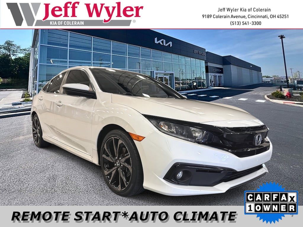 Jeff Wyler Kia of Colerain is excited to offer this fantastic-looking 2020 Honda Civic Sport in Platinum White Pearl. 4-Wheel Disc Brakes, 8 Speakers, ABS brakes, Adaptive Cruise Control: Adaptive Cruise Control (ACC) with Low-Speed Follow, Air Conditioning, Alloy wheels, AM/FM radio, Apple CarPlay/Android Auto, Auto High-beam Headlights, Automatic temperature control, Brake assist, Bumpers: body-color, Cloth Seat Trim, Delay-off headlights, Driver door bin, Driver vanity mirror, Dual front impact airbags, Dual front side impact airbags, Electronic Stability Control, Emergency communication system: HondaLink, Exterior Parking Camera Rear, Forward collision: Collision Mitigation Braking System (CMBS) + FCW mitigation, Four wheel independent suspension, Front anti-roll bar, Front Bucket Seats, Front Center Armrest, Front fog lights, Front reading lights, Fully automatic headlights, Illuminated entry, Lane departure: Lane Keeping Assist System (LKAS) active, Leather Shift Knob, Low tire pressure warning, Occupant sensing airbag, Outside temperature display, Overhead airbag, Panic alarm, Passenger door bin, Passenger vanity mirror, Power door mirrors, Power steering, Power windows, Radio data system, Radio: 180-Watt AM/FM Audio System, Rear anti-roll bar, Rear window defroster, Remote keyless entry, Security system, Speed control, Speed-sensing steering, Split folding rear seat, Spoiler, Steering wheel mounted audio controls, Tachometer, Telescoping steering wheel, Tilt steering wheel, Traction control, Trip computer, and Wheels: 18" Alloy w/Gloss Black Inserts Our PRE-OWNED vehicles are put through a rigorous 167- POINT QUALITY ASSURANCE INSPECTION along with an average amount of over $1,400.00 SPENT to recondition each vehicle so we can be sure to deliver you the highest quality vehicle like you deserve! ***ONLINE PRICE DOES NOT INCLUDE WYLER FAMILY FIRST PACKAGE***