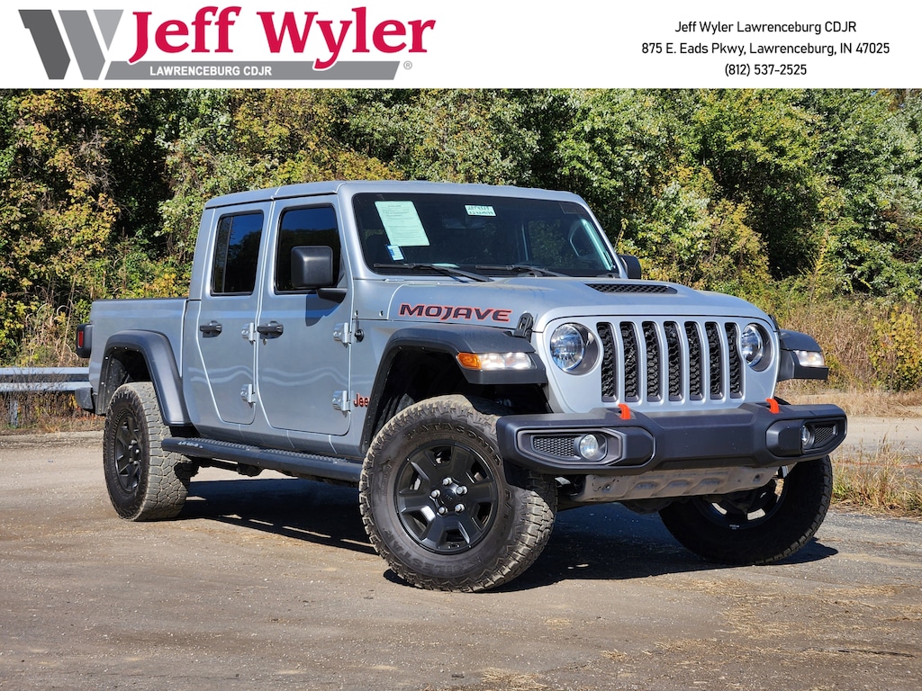 Jeff Wyler Chrysler Dodge Jeep of Lawrenceburg is proud to offer this beautiful-looking 2022 Jeep Gladiator Mojave in Silver Zynith Clearcoat. Quick Order Package 24D, 4-Wheel Disc Brakes, 4.10 Rear Axle Ratio, 9 Speakers, 97 MPH Vehicle Max Speed Calibration, ABS brakes, Air Conditioning, Alloy wheels, AM/FM radio: SiriusXM, Apple CarPlay/Android Auto, Auto-dimming Rear-View mirror, Automatic temperature control, Body Color 3-Piece Hard Top, Brake assist, Compass, Corning Gorilla Glass, Delay-off headlights, Driver door bin, Driver vanity mirror, Dual front impact airbags, Dual front side impact airbags, Electronic Stability Control, Emergency communication system: SiriusXM Guardian, Freedom Panel Storage Bag, Front anti-roll bar, Front Bucket Seats, Front Center Armrest w/Storage, Front dual zone A/C, Front fog lights, Front reading lights, Fully automatic headlights, Garage door transmitter, Heated door mirrors, Heavy Duty Suspension w/Gas Shocks, Illuminated entry, Integrated Off-Road Camera, Integrated roll-over protection, Leather steering wheel, Low tire pressure warning, Navigation System, No Soft Top, Occupant sensing airbag, Outside temperature display, Panic alarm, ParkView Rear Back-Up Camera, Passenger door bin, Passenger vanity mirror, Power door mirrors, Power steering, Power windows, Premium Cloth Seats w/Sport Bolsters, Radio data system, Radio: Uconnect 4C Nav w/8.4" Display, Rear anti-roll bar, Rear reading lights, Rear Sliding Window, Rear Window Defroster, Remote keyless entry, Security system, Speed control, Split folding rear seat, Steering wheel mounted audio controls, Tachometer, Telescoping steering wheel, Tilt steering wheel, Traction control, Trip computer, Variably intermittent wipers, Voltmeter, and Wheels: 17" x 7.5" Low Gloss Black Aluminum Our PRE-OWNED vehicles are put through a rigorous 167- POINT QUALITY ASSURANCE INSPECTION along with an average amount of over $1,400.00 SPENT to recondition each vehicle so we can be sure to deliver you the highest quality vehicle like you deserve! ***ONLINE PRICE DOES NOT INCLUDE WYLER FAMILY FIRST PACKAGE*** Stop by 4136 Shelbyville Road to see for yourself, or give us a call @ 502-897-3151 to schedule your test drive! Ask about available certifications.