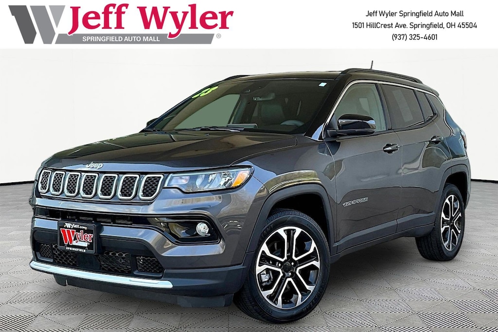 Jeff Wyler Springfield Auto Mall is pleased to offer this gorgeous 2023 Jeep Compass Limited in Granite Crystal Metallic Clearcoat. Well equipped with: Quick Order Package 29G, 10.1" Touchscreen Display, 3.73 Final Drive Ratio, 4-Wheel Disc Brakes, 6 Speakers, ABS brakes, Air Conditioning, Alloy wheels, AM/FM radio: SiriusXM, Auto High-beam Headlights, Auto-dimming Rear-View mirror, Automatic temperature control, Brake assist, Bumpers: body-color, Compass, Delay-off headlights, Disassociated Touchscreen Display, Driver door bin, Driver vanity mirror, Dual front impact airbags, Dual front side impact airbags, Electronic Stability Control, Four wheel independent suspension, Front anti-roll bar, Front Bucket Seats, Front Center Armrest w/Storage, Front dual zone A/C, Front fog lights, Front License Plate Bracket, Front reading lights, Fully automatic headlights, Heated door mirrors, Heated front seats, Heated steering wheel, Hidden Exhaust Tips-Dual, Illuminated entry, Knee airbag, Leather Shift Knob, Leatherette Seats, Low tire pressure warning, Occupant sensing airbag, Outside temperature display, Overhead airbag, Overhead console, Panic alarm, ParkView Rear Back-Up Camera, Passenger door bin, Passenger vanity mirror, Power door mirrors, Power driver seat, Power steering, Power windows, Radio: Uconnect 5 w/10.1" Display, Rain sensing wipers, Rear anti-roll bar, Rear seat center armrest, Rear window defroster, Rear window wiper, Remote keyless entry, Security system, SiriusXM Radio Service, Speed control, Split folding rear seat, Spoiler, Steering wheel mounted audio controls, Tachometer, Telescoping steering wheel, Tilt steering wheel, Traction control, Trip computer, Turn signal indicator mirrors, Variably intermittent wipers, and Wheels: 18" x 7" Painted Diamond Cut Aluminum. Ask about available certifications. Used vehicles 10 years of age or newer with less than 100,000 miles are eligible for the Wyler Assurance Program, but eligible vehicles must pass our reconditioning process and multi-point inspection. Provided the vehicle passes inspection, vehicles will be eligible for the 6 month/6,000 mile limited warranty. The 6 month/6,000 mile limited warranty is NOT available on AS-IS vehicles, wholesale vehicles, lease buyback/pass-thru vehicles or un-inspected vehicles. Note that this program can also apply to vehicles where the remaining factory coverage is less than 6 months or 6,000 miles. Please check the Federal Trade Commission (FTC) Buyers guide on the vehicle for full details as to whether or not warranty coverage may apply. Contact Dealer for additional details. The Wyler Assurance 6 month/6,000 Mile limited warranty ends 6 months from the date of the Retail Purchase Agreement (BUYERS ORDER) or when the vehicle's odometer registers 6,000 additional miles to the mileage listed on the BUYERS ORDER, whichever comes first. Your Deductible - The warranty holder on your contract pays the first $100 of each covered repair.