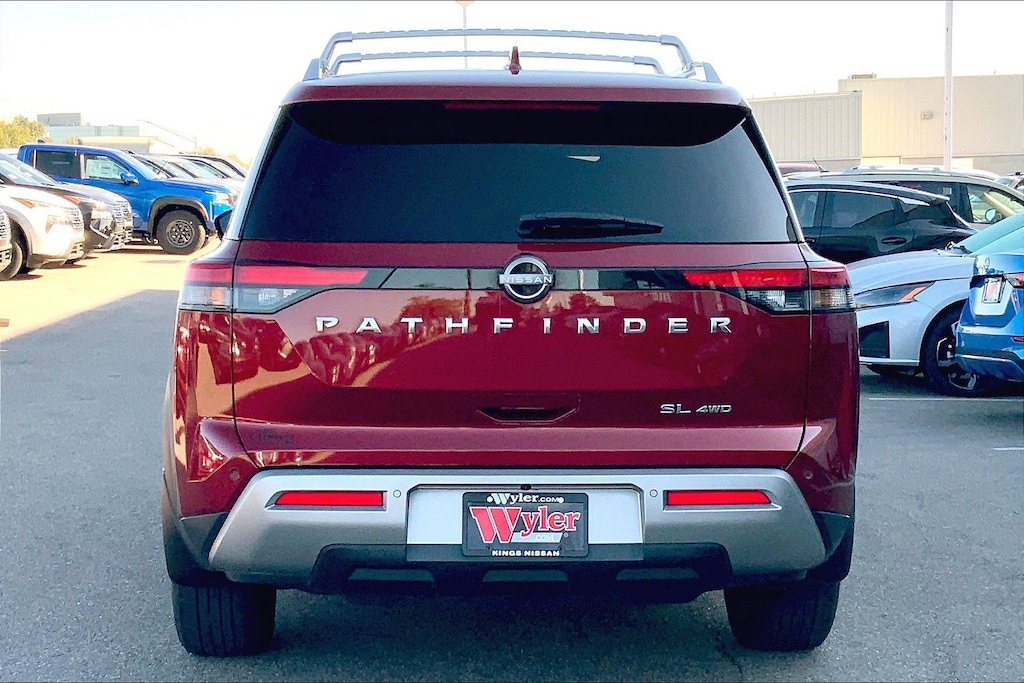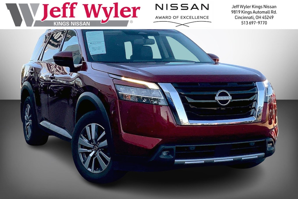 Jeff Wyler Kings Nissan is delighted to offer this attractive 2022 Nissan Pathfinder SL in Scarlet Ember Tintcoat. Well equipped with: 4WD, 18" Machined Alloy Wheels, 3rd row seats: bench, 4-Wheel Disc Brakes, 6 Speakers, ABS brakes, Air Conditioning, Alloy wheels, AM/FM radio: SiriusXM, Auto High-beam Headlights, Auto-dimming Rear-View mirror, Automatic temperature control, Axle Ratio: TBD, Bench Seat Carpeted Floor Mats (Set of 4), Black Splash Guards (Set of 4), Brake assist, Bumpers: body-color, Cross Bars, Delay-off headlights, Driver door bin, Driver vanity mirror, Dual front impact airbags, Dual front side impact airbags, Electronic Stability Control, Emergency communication system: NissanConnect Services, Exterior Parking Camera Rear, Four wheel independent suspension, Front anti-roll bar, Front Bucket Seats, Front Center Armrest, Front dual zone A/C, Front fog lights, Front reading lights, Fully automatic headlights, Garage door transmitter: HomeLink, Heated door mirrors, Heated Front Bucket Seats, Heated front seats, Heated steering wheel, Illuminated entry, Knee airbag, Leather Seating Surfaces, Leather steering wheel, Low tire pressure warning, Navigation system: NissanConnect Navigation, NissanConnect w/Navigation & Services, Occupant sensing airbag, Outside temperature display, Overhead airbag, Overhead console, Panic alarm, Passenger door bin, Passenger vanity mirror, Power door mirrors, Power driver seat, Power Liftgate, Power passenger seat, Power steering, Power windows, Radio data system, Radio: AM/FM Audio System, Rear air conditioning, Rear anti-roll bar, Rear reading lights, Rear seat center armrest, Rear side impact airbag, Rear window defroster, Rear window wiper, Reclining 3rd row seat, Remote keyless entry, Security system, Speed control, Speed-sensing steering, Split folding rear seat, Spoiler, Steering wheel mounted audio controls, Tachometer, Telescoping steering wheel, Tilt steering wheel, Traction control, Trip computer, Turn signal indicator mirrors, and Variably intermittent wipers.Ask about available certifications.