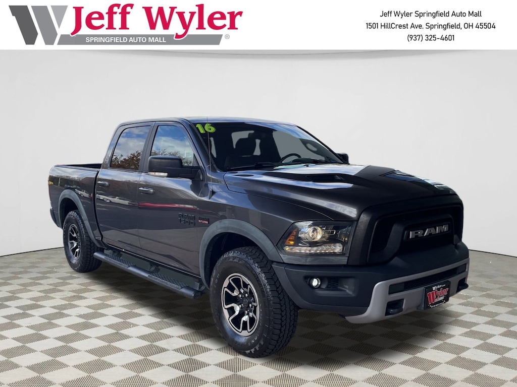 Jeff Wyler Springfield Auto Mall is pumped up to offer this charming 2016 Ram 1500 Rebel in Granite Crystal Metallic Clearcoat. Well equipped with: Luxury Group (Auto-Dimming Exterior Mirrors, Exterior Mirrors Courtesy Lamps, Exterior Mirrors w/Supplemental Signals, Glove Box Lamp, LED Bed Lighting, Overhead Console w/Garage Door Opener, Power Folding Mirrors, Power Heated Fold-Away Mirrors, Rear Dome w/On/Off Switch Lamp, Rear-View Auto-Dimming Mirror w/Microphone, Sun Visors w/Illuminated Vanity Mirrors, Underhood Lamp, and Universal Garage Door Opener), Protection Group, Quick Order Package 26W Rebel (Dual Rear Exhaust w/Bright Tips, Flat Black 5.7L Hemi Badge, Flat Black Ram 1500 Badge, and Ram Glove Box Badge), 3.92 Rear Axle Ratio, 4-Wheel Disc Brakes, 6 Month Trial (Reg. Required), 6 Month Trial (Registration Required), 6 Speakers, 8.4" Touchscreen Display, 9 Alpine Speakers w/Subwoofer, ABS brakes, Air Conditioning, Air Conditioning ATC w/Dual Zone Control, Alloy wheels, AM/FM radio, Auto-leveling suspension, Brake assist, Compass, Delay-off headlights, Driver door bin, Dual front impact airbags, Dual front side impact airbags, Electronic Shift, Electronic Stability Control, Engine Block Heater, For Details Visit DriveUconnect.com, Front anti-roll bar, Front Bucket Seats, Front Center Armrest w/Storage, Front fog lights, Front reading lights, Front wheel independent suspension, Fully automatic headlights, GPS Antenna Input, Heated door mirrors, Heated front seats, Heated steering wheel, Illuminated entry, Integrated Voice Command w/Bluetooth, Keyless Enter-N-Go, Leather steering wheel, Low tire pressure warning, Manufacturer's Statement of Origin, Media Hub (SD, USB, AUX), Nav-Capable! See Dealer for Details, Occupant sensing airbag, Outside temperature display, Overhead airbag, Overhead console, Panic alarm, ParkView Rear Back-Up Camera, Passenger door bin, Passenger vanity mirror, Power door mirrors, Power driver seat, Power passenger seat, Power steering, Power windows, Premium Cloth Seats w/Emboss Tread Pattern, Radio data system, Radio: Uconnect 5.0, Radio: Uconnect 8.4, Rear anti-roll bar, Rear seat center armrest, Rear step bumper, Rear View Auto Dim Mirror w/Display, Rebel Instrument Cluster, Remote keyless entry, Remote Proximity Keyless Entry, Remote SD Card Slot, Single Disc Remote CD Player, SIRIUSXM Satellite Radio, Speed control, Split folding rear seat, Steering wheel mounted audio controls, Tachometer, Tilt steering wheel, Tip Start, Traction control, Trip computer, Uconnect Access, Variably intermittent wipers, Voltmeter, and Wheels: 17" x 8" Aluminum w/Matte Black PockeT. Reviews: * Smooth-riding coil spring rear suspension also enables air-suspension option; excellent trio of engine choices; smooth and efficient eight-speed automatic transmission; Rebel 1500 off-road package more than just stickers; cabin is quiet and attractive; straightforward controls and audio. Source: EdmundsAsk about available certifications. Used vehicles 10 years of age or newer with less than 100,000 miles are eligible for the Wyler Assurance Program, but eligible vehicles must pass our reconditioning process and multi-point inspection. Provided the vehicle passes inspection, vehicles will be eligible for the 6 month/6,000 mile limited warranty. The 6 month/6,000 mile limited warranty is NOT available on AS-IS vehicles, wholesale vehicles, lease buyback/pass-thru vehicles or un-inspected vehicles. Note that this program can also apply to vehicles where the remaining factory coverage is less than 6 months or 6,000 miles. Please check the Federal Trade Commission (FTC) Buyers guide on the vehicle for full details as to whether or not warranty coverage may apply. Contact Dealer for additional details. The Wyler Assurance 6 month/6,000 Mile limited warranty ends 6 months from the date of the Retail Purchase Agreement (BUYERS ORDER) or when the vehicle's odometer registers 6,000 additional miles to the mileage listed on the BU