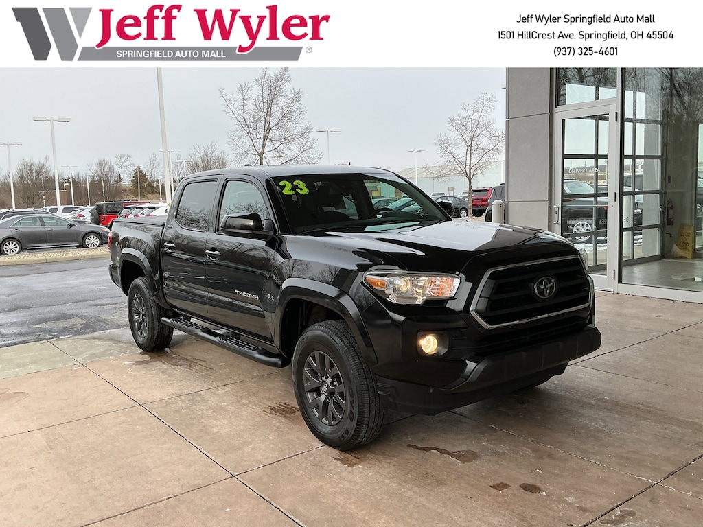 Jeff Wyler Springfield Auto Mall is honored to offer this attractive 2023 Toyota Tacoma SR5 in Black. Well equipped with: ABS brakes, Active Cruise Control, Alloy wheels, Electronic Stability Control, Front dual zone A/C, Heated door mirrors, Illuminated entry, Low tire pressure warning, Remote keyless entry, Traction control, 6 Speakers, Air Conditioning, AM/FM radio: SiriusXM, Anti-whiplash front head restraints, Apple CarPlay/Android Auto, Auto High-beam Headlights, Auto-dimming Rear-View mirror, Automatic temperature control, Axle Ratio: 3.91, Black Headlamp Bezel, Brake assist, Bumpers: body-color, Daytime Running Lamps, Driver door bin, Dual front impact airbags, Dual front side impact airbags, Emergency communication system: Safety Connect (1-year trial), Exterior Parking Camera Rear, Fabric Seat Trim, Front anti-roll bar, Front Bucket Seats, Front Center Armrest, Front fog lights, Front reading lights, Front Seats, Front wheel independent suspension, Knee airbag, Occupant sensing airbag, Outside temperature display, Overhead airbag, Overhead console, Panic alarm, Passenger door bin, Power door mirrors, Power driver seat, Power steering, Power windows, Radio: Audio, Rear step bumper, Speed control, Speed-sensing steering, Split folding rear seat, Steering wheel mounted audio controls, Tachometer, Telescoping steering wheel, Tilt steering wheel, Trip computer, Variably intermittent wipers, and Wheels: 16" Dark Gray Alloy. Ask about available certifications. Used vehicles 10 years of age or newer with less than 100,000 miles are eligible for the Wyler Assurance Program, but eligible vehicles must pass our reconditioning process and multi-point inspection. Provided the vehicle passes inspection, vehicles will be eligible for the 6 month/6,000 mile limited warranty. The 6 month/6,000 mile limited warranty is NOT available on AS-IS vehicles, wholesale vehicles, lease buyback/pass-thru vehicles or un-inspected vehicles. Note that this program can also apply to vehicles where the remaining factory coverage is less than 6 months or 6,000 miles. Please check the Federal Trade Commission (FTC) Buyers guide on the vehicle for full details as to whether or not warranty coverage may apply. Contact Dealer for additional details. The Wyler Assurance 6 month/6,000 Mile limited warranty ends 6 months from the date of the Retail Purchase Agreement (BUYERS ORDER) or when the vehicle's odometer registers 6,000 additional miles to the mileage listed on the BUYERS ORDER, whichever comes first. Your Deductible - The warranty holder on your contract pays the first $100 of each covered repair.